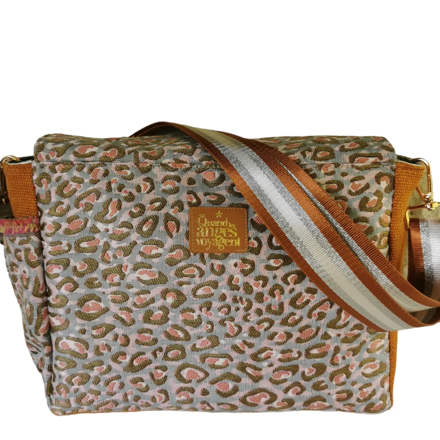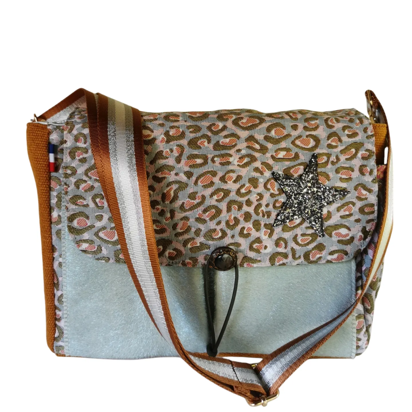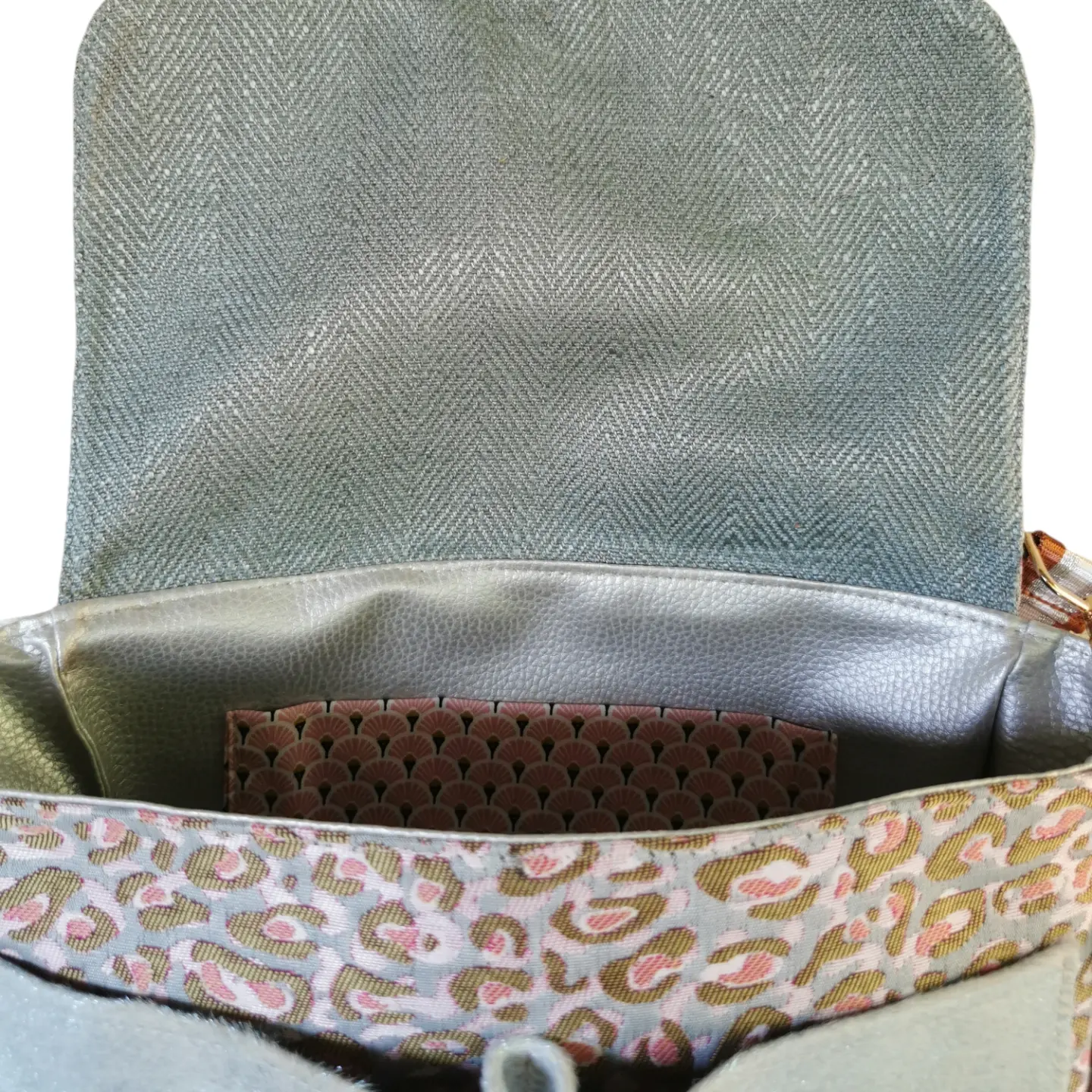 Un jacquard léopard , un coton pour les côtés, un cuir à poils pour les poches, un lin à chevrons pour la doublure du rabat et un simili argenté de très belle qualité pour l intérieur.