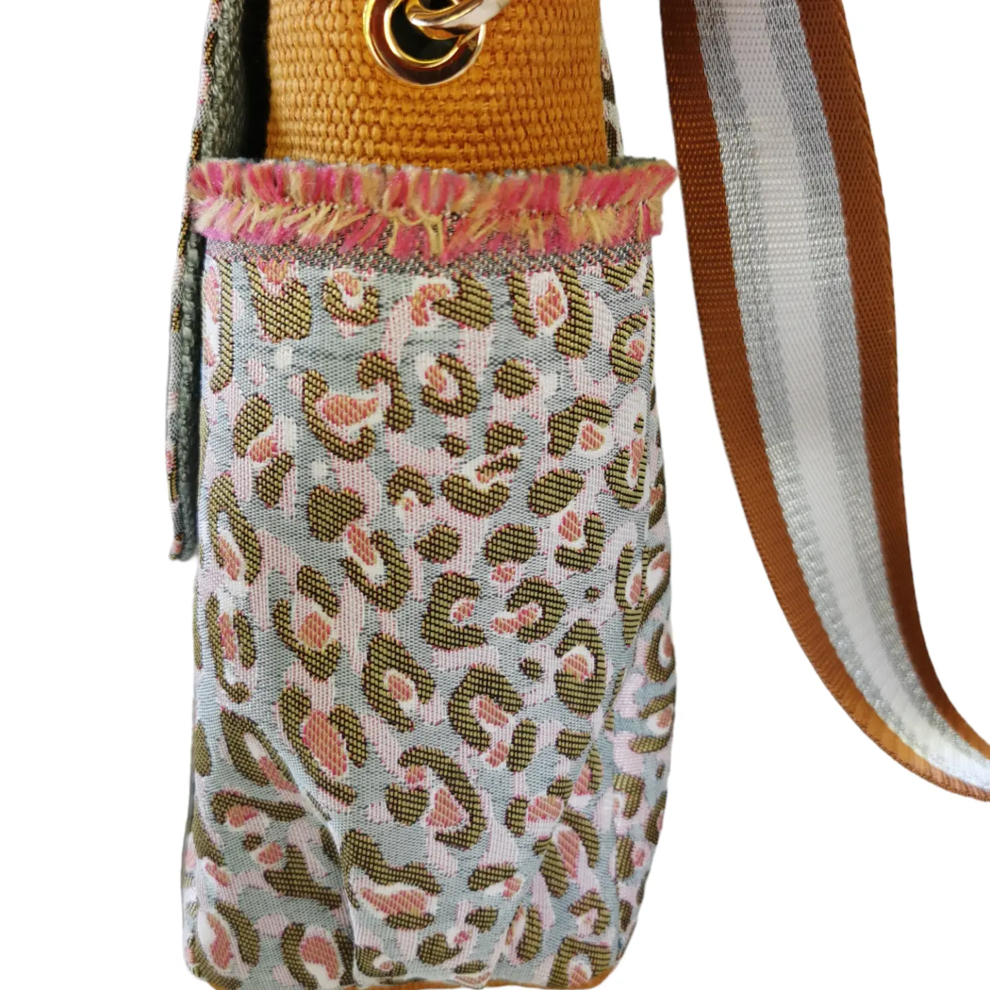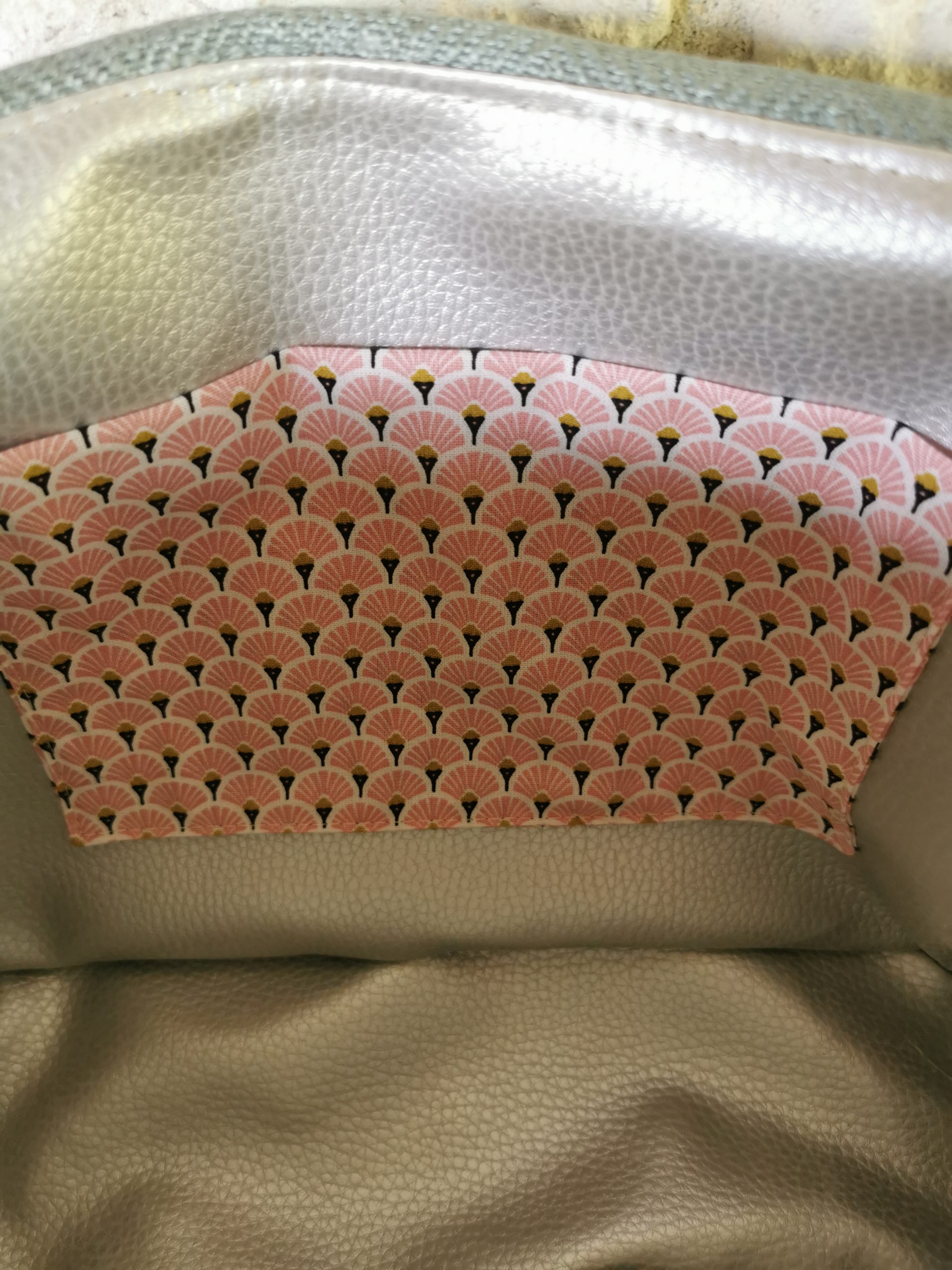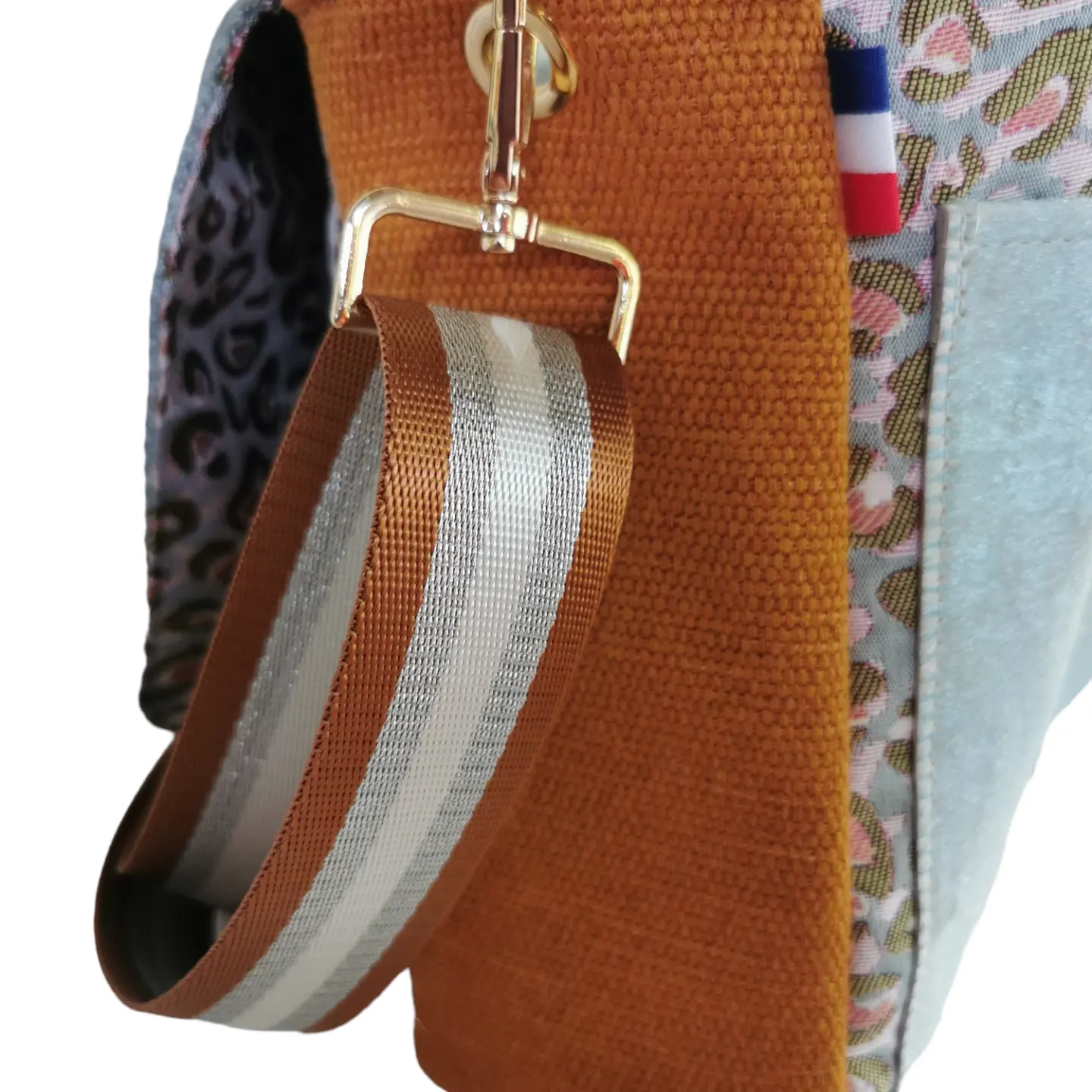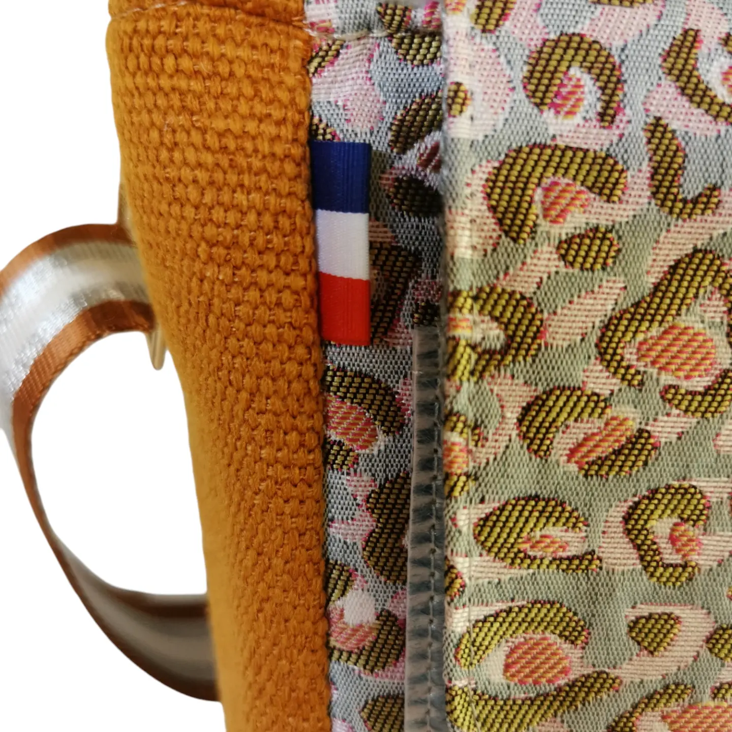 Un jacquard léopard , un coton pour les côtés, un cuir à poils pour les poches, un lin à chevrons pour la doublure du rabat et un simili argenté de très belle qualité pour l intérieur.