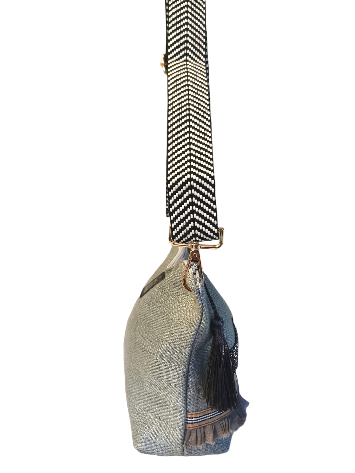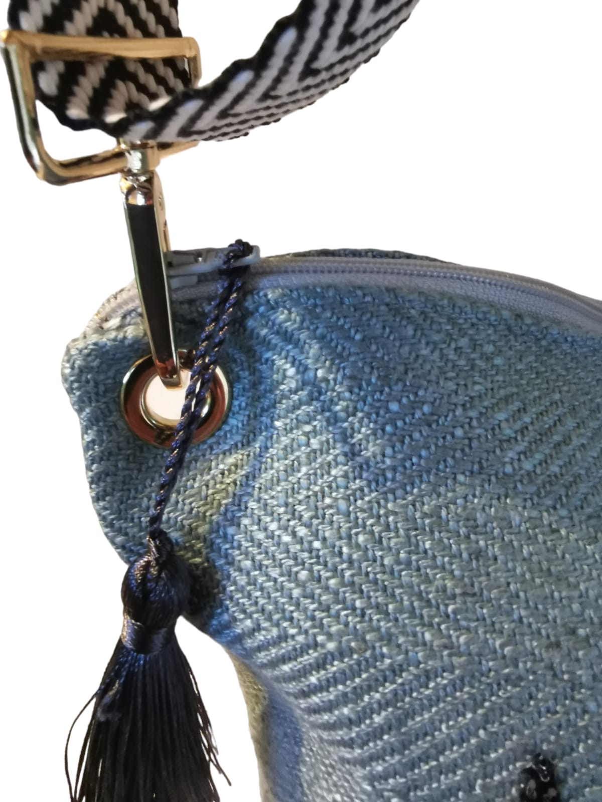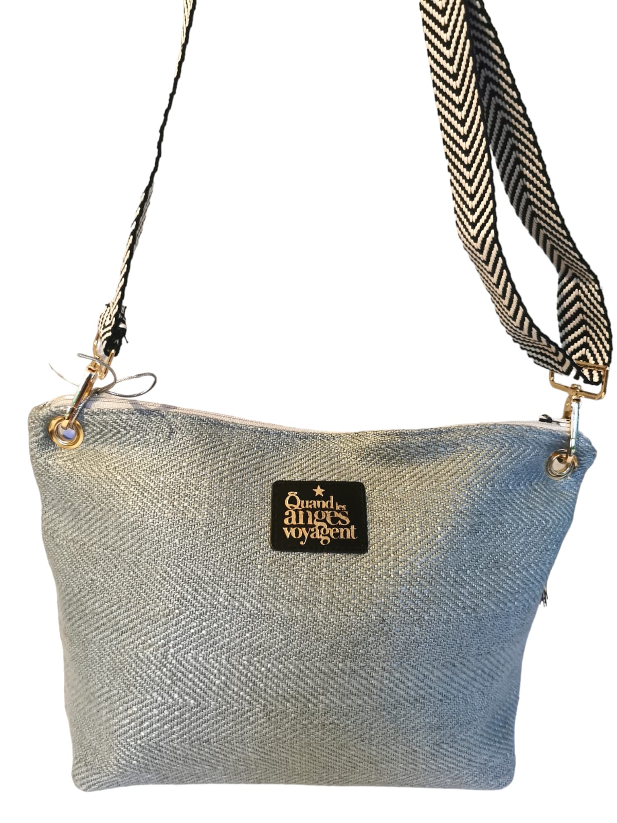Un très joli sac bandoulière en lin bleu glacier à chevrons et galon.