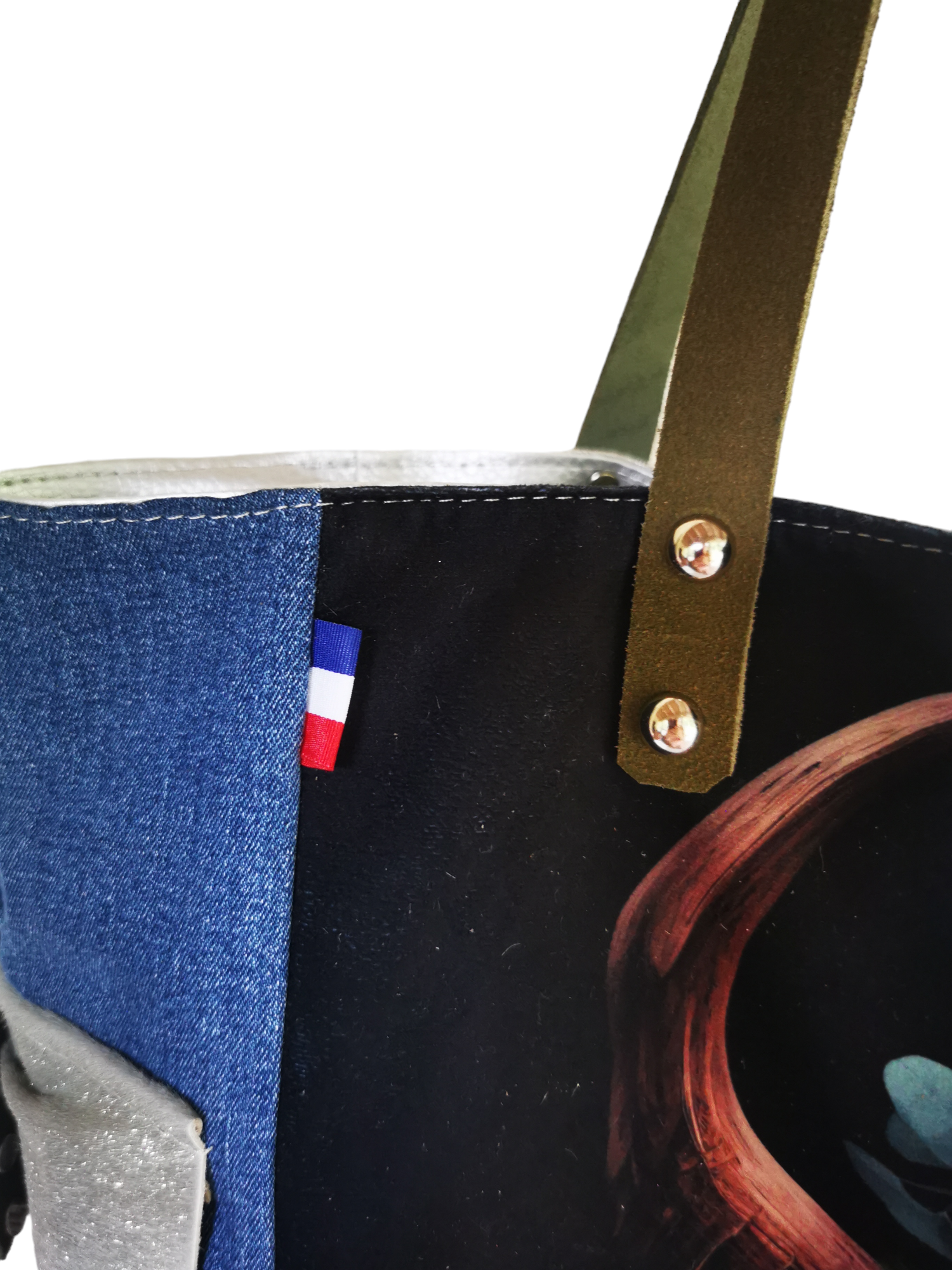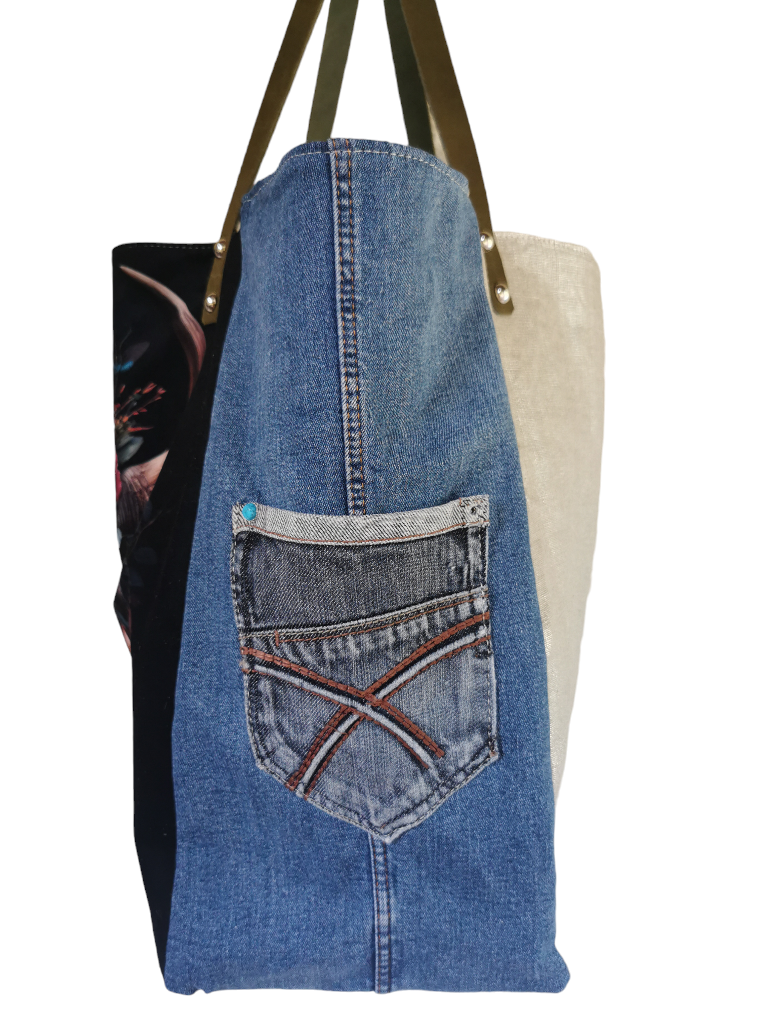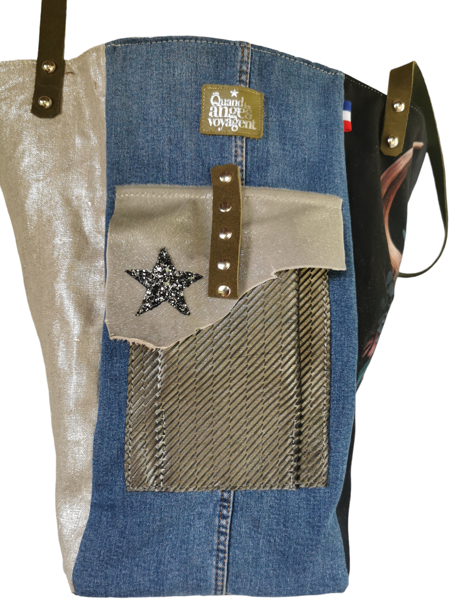 Cabas en association d un tissu velours imprimé aux couleurs éclatantes, de découpe de Jean sur les côtés. Sur celle-ci j’ai rajouté d’un côté une poche de jean et de l’autre une poche que j’ai créé en cuir avec un rabat sur lequel une étoile en glitter est cousue.