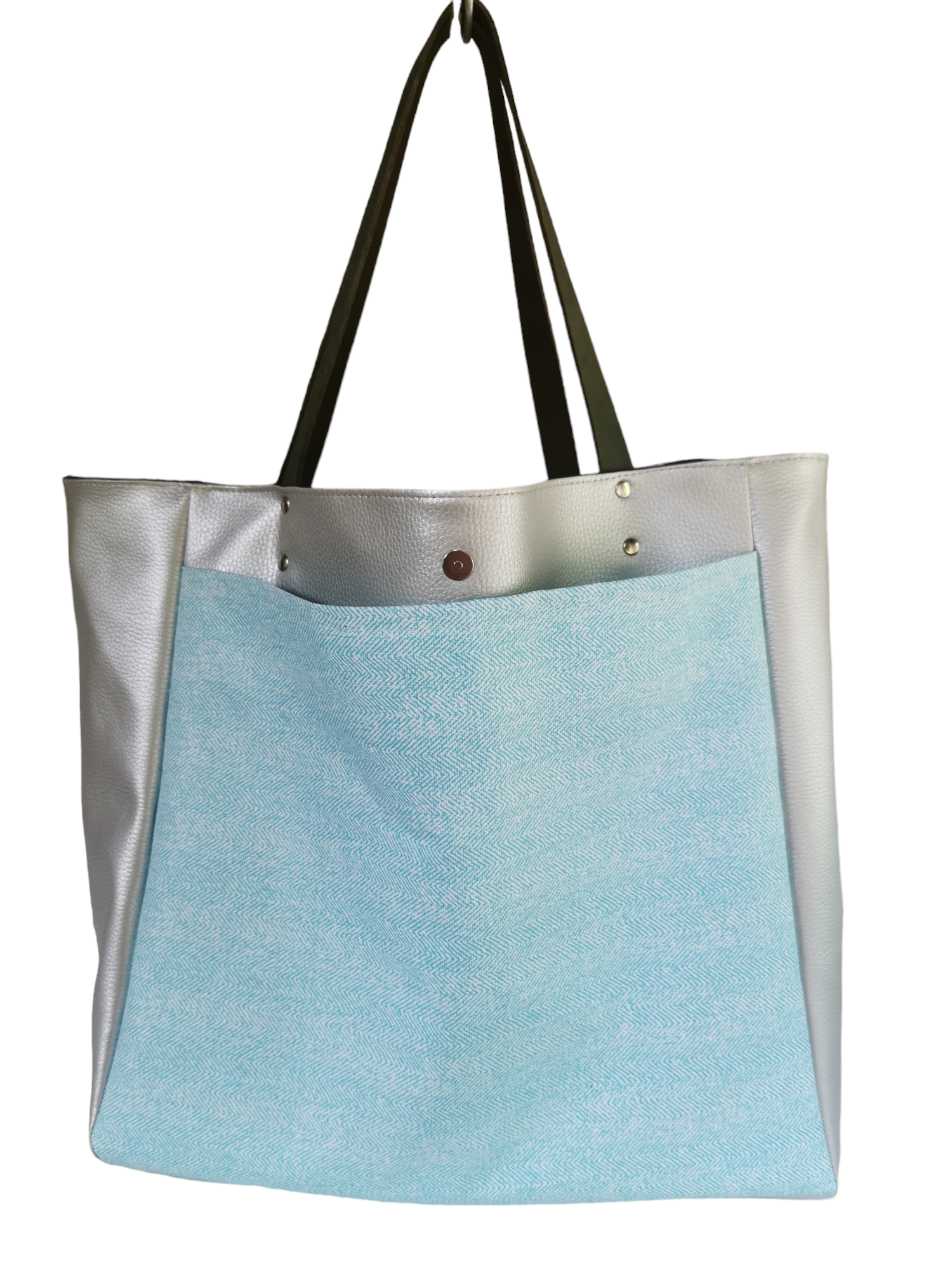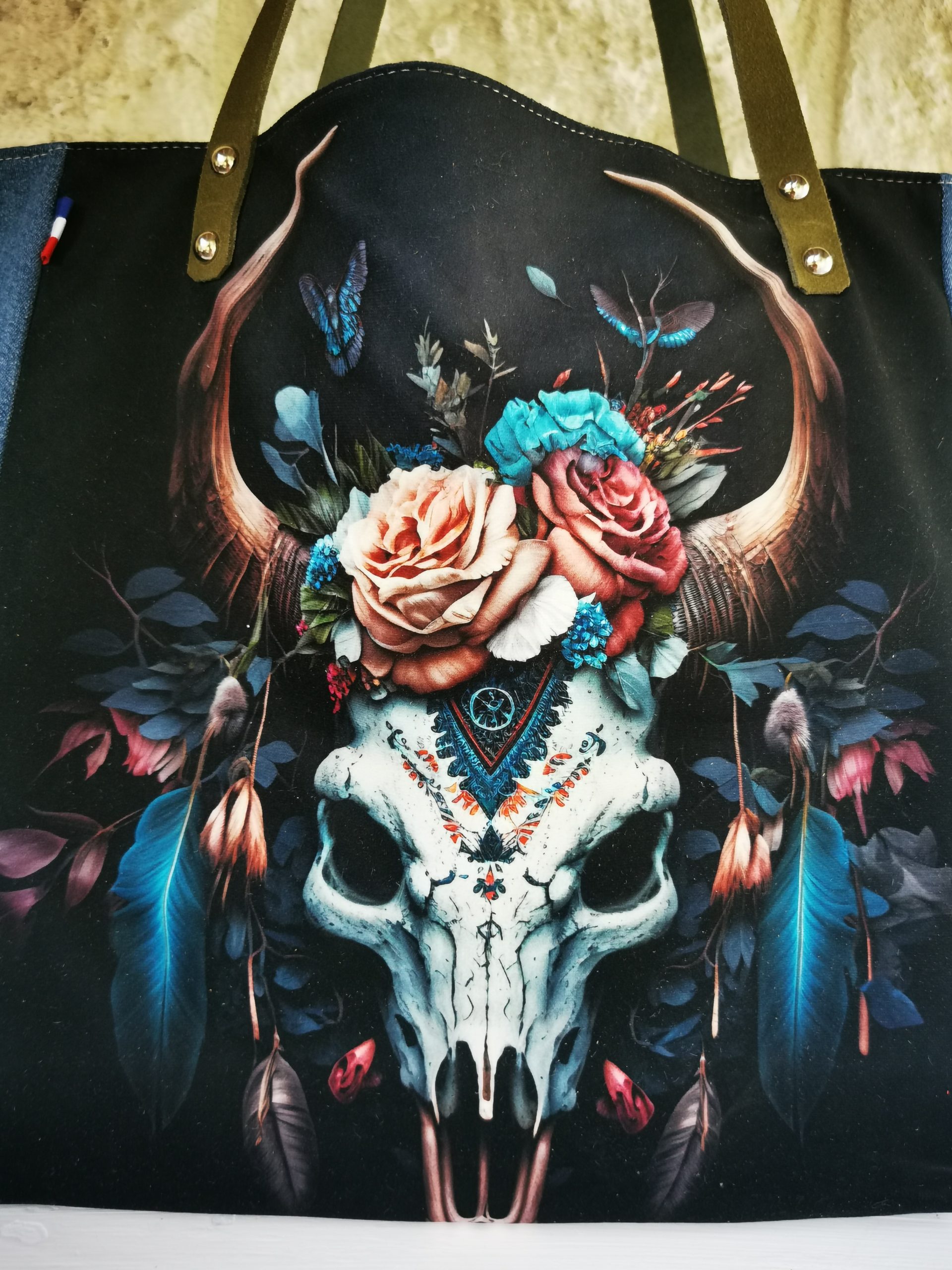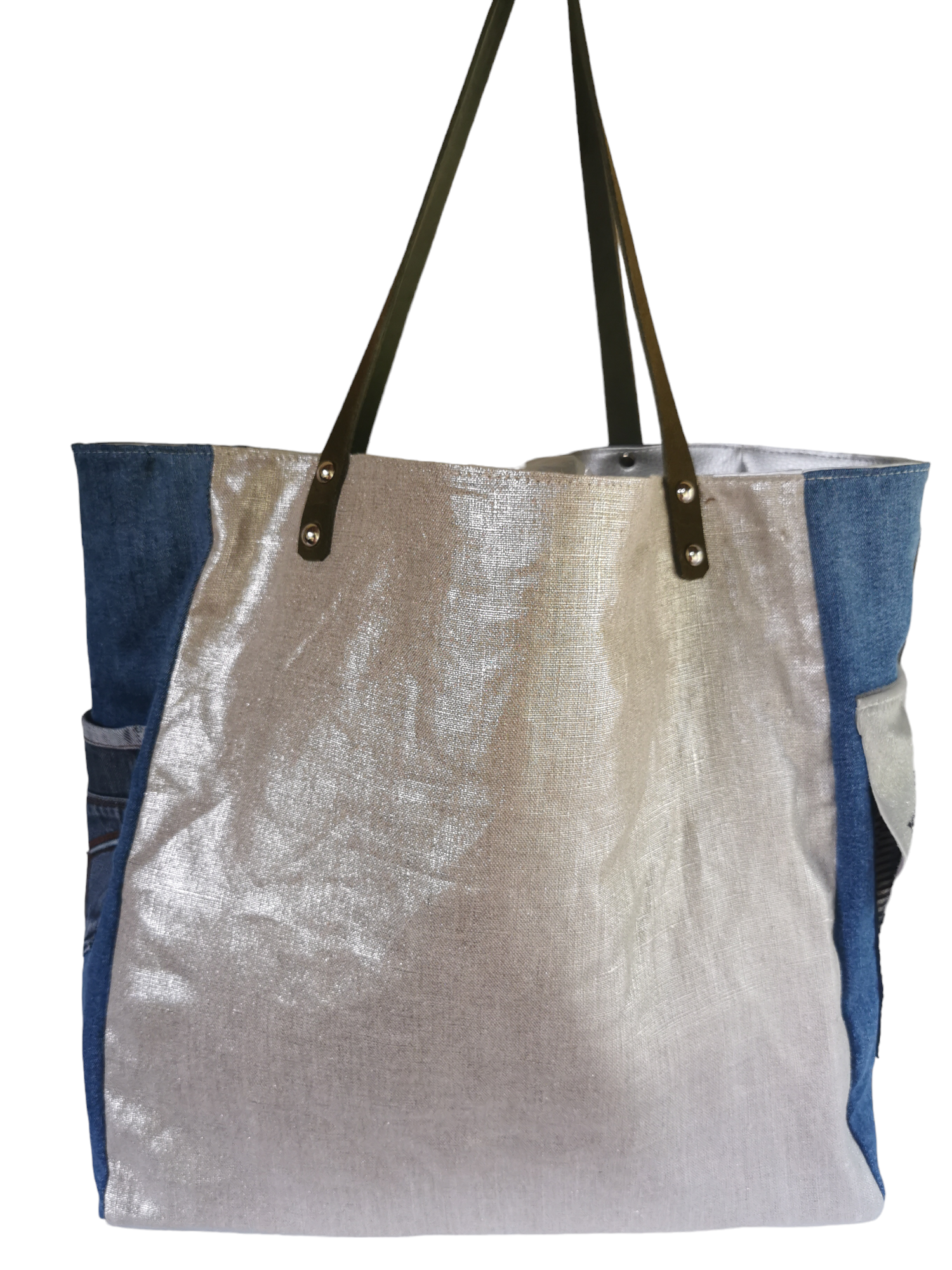 Cabas en association d un tissu velours imprimé aux couleurs éclatantes, de découpe de Jean sur les côtés. Sur celle-ci j’ai rajouté d’un côté une poche de jean et de l’autre une poche que j’ai créé en cuir avec un rabat sur lequel une étoile en glitter est cousue.