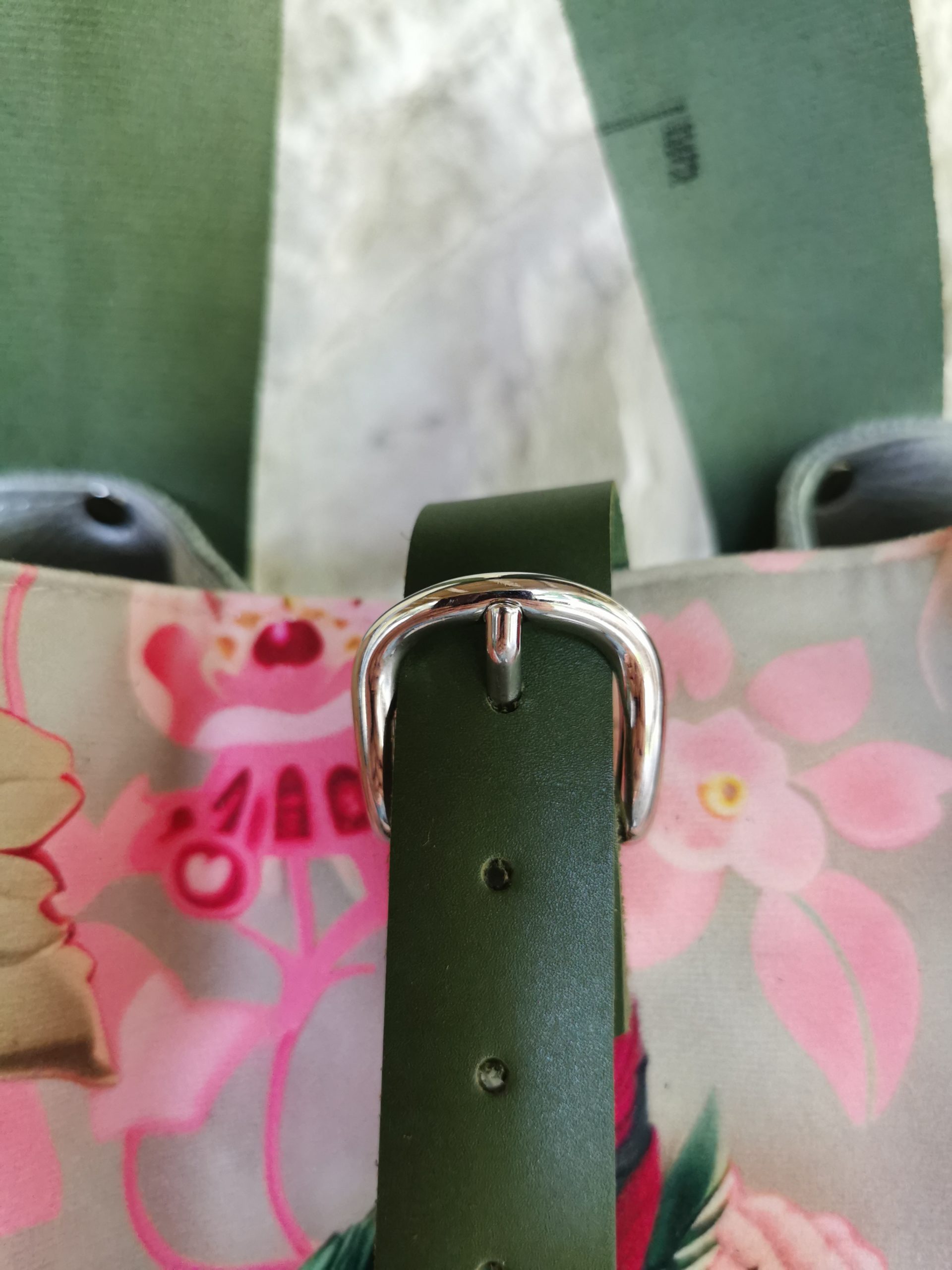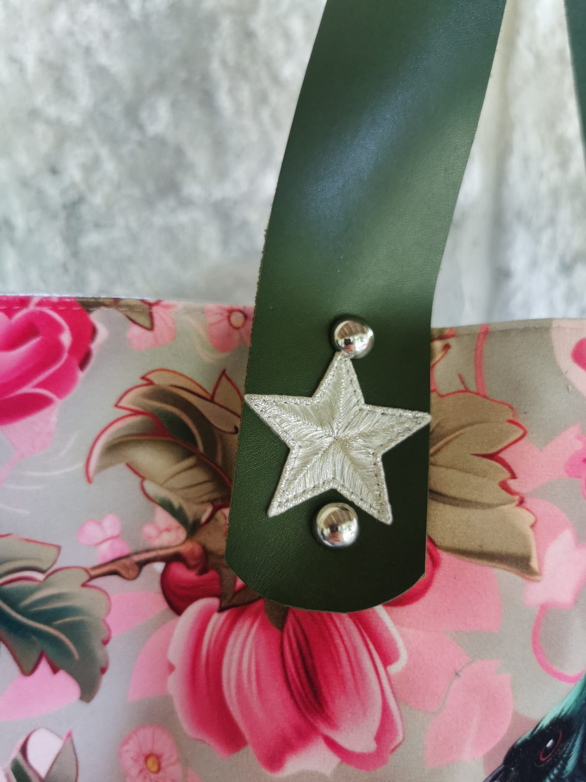 Les anses sont en cuir et fixées par des rivets nickelés. Une étoile est cousue sur l une d elles.